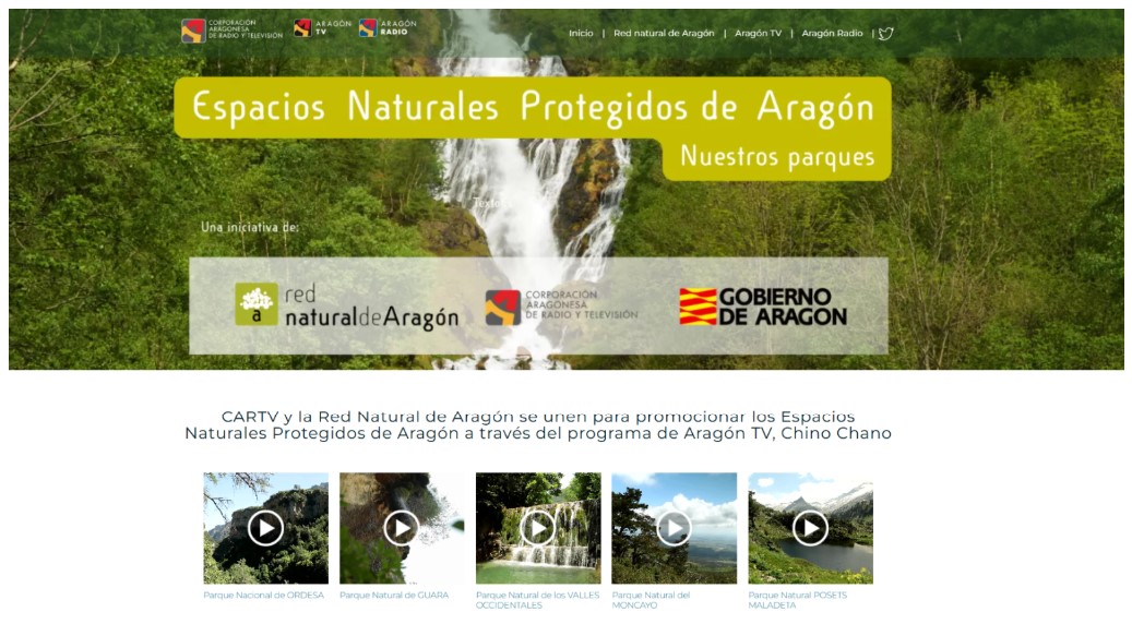 Desde este mes de noviembre, esta web accesible pinchando en el siguiente enlace (web Nuestros Parques) aglutina los contenidos generados, tanto en Aragón Televisión como en Aragón Radio, en los que se ha dado a conocer este año el Parque Nacional de Ordesa y Monte Perdido, el Parque Natural de los Valles Occidentales, el Parque Natural Posets Maladeta, el Parque Natural del Moncayo y el Parque Natural de la Sierra y Cañones de Guara.